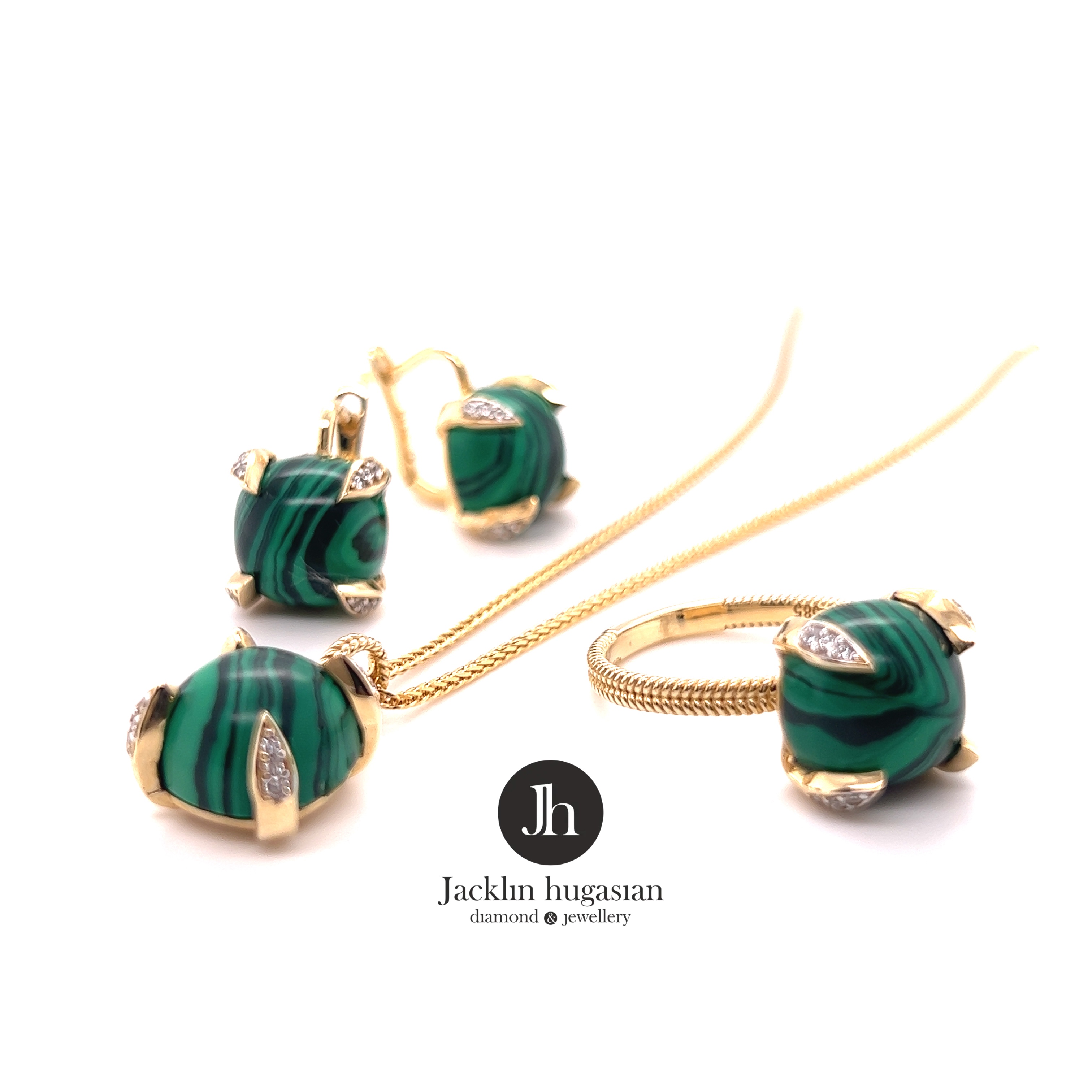 Комплект от “Jacklin hugasian” в жълто злато с малахит и цирконии.