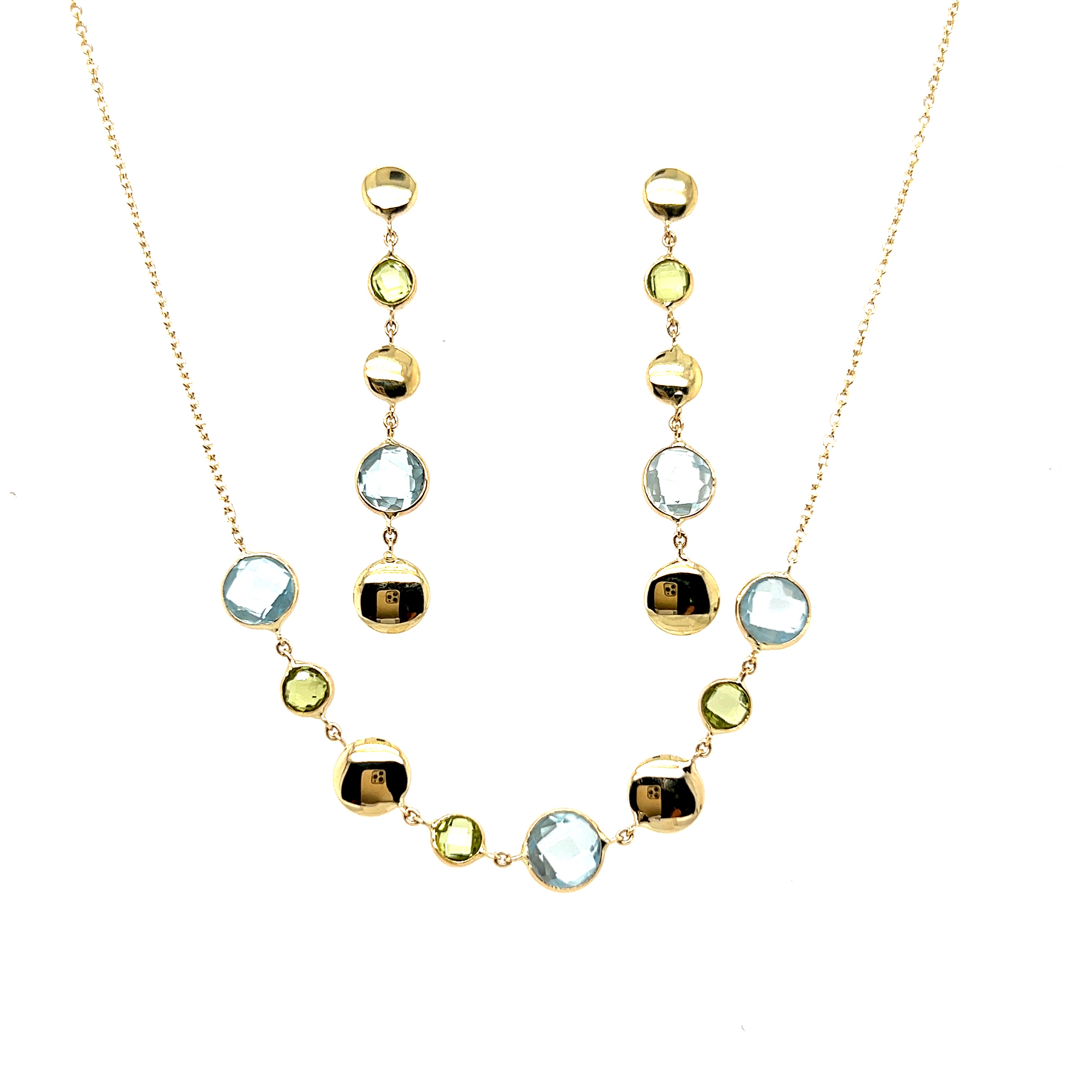 Обеци от “ Jacklin hugasian “ в жълто злато с аквамарин и перидот.