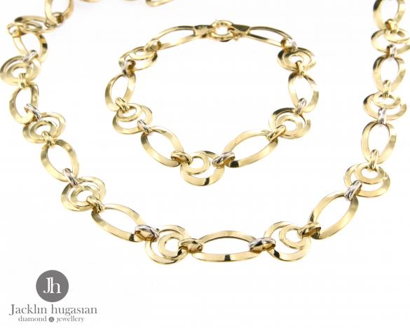 Комплект колие и гривна от "Jacklin hugasian" в жълто и бяло злато гланц. Дължина колие 49 см. Дължина гривна 19 см.