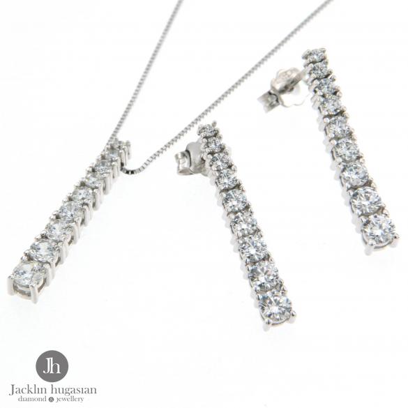 Комплект колие и обеци от " Jacklin hugasian " в бяло злато,гланц с цирконии. Дължина обеци 2.5 см., широчина 0.3 см. Дължина колие 44 см./ с възможност за регулиране на дължината/. Произход Италия.