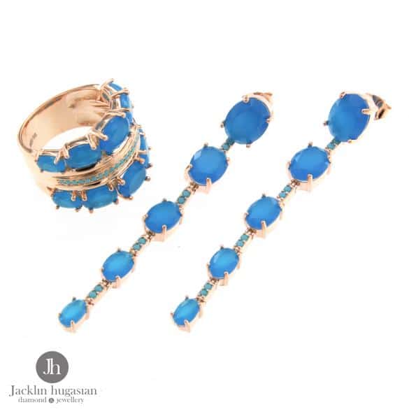Комплект пръстен и обеци от" Jacklin hugasian " розово сребро с тюркоаз и син ахат.Дължина обеци 6 см.