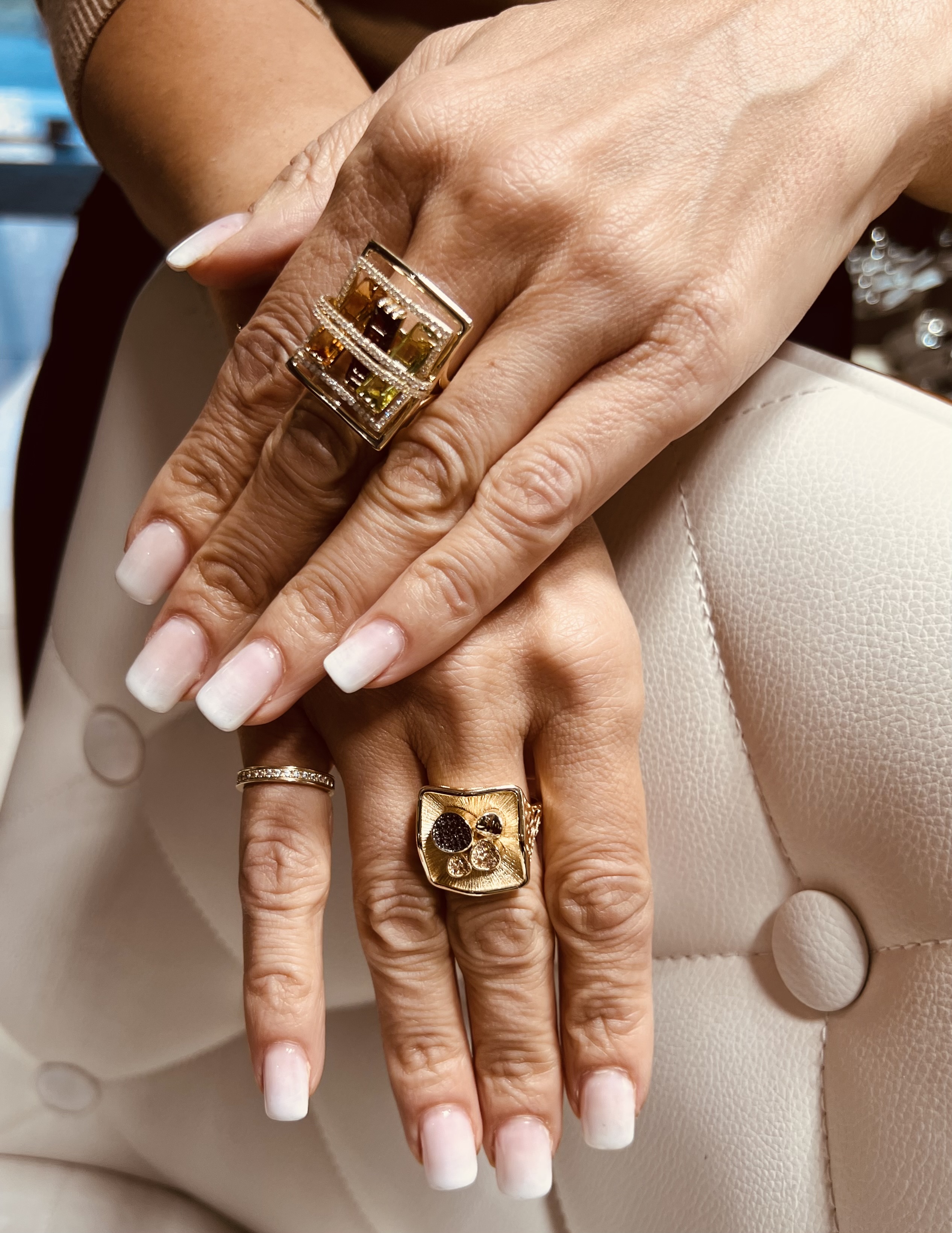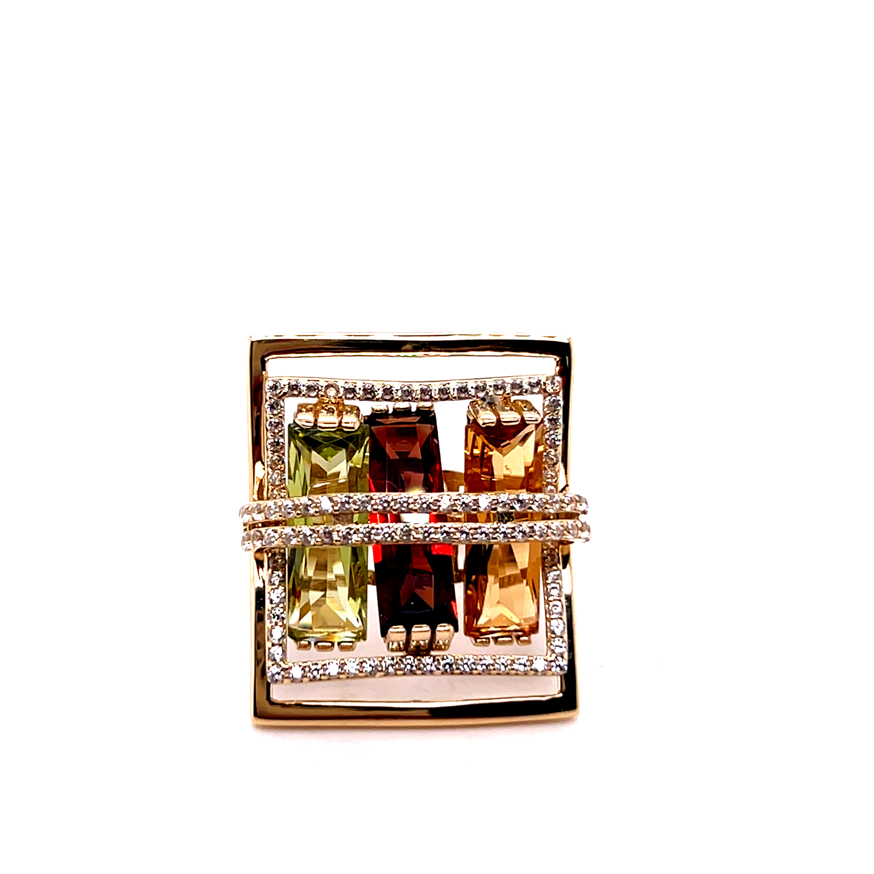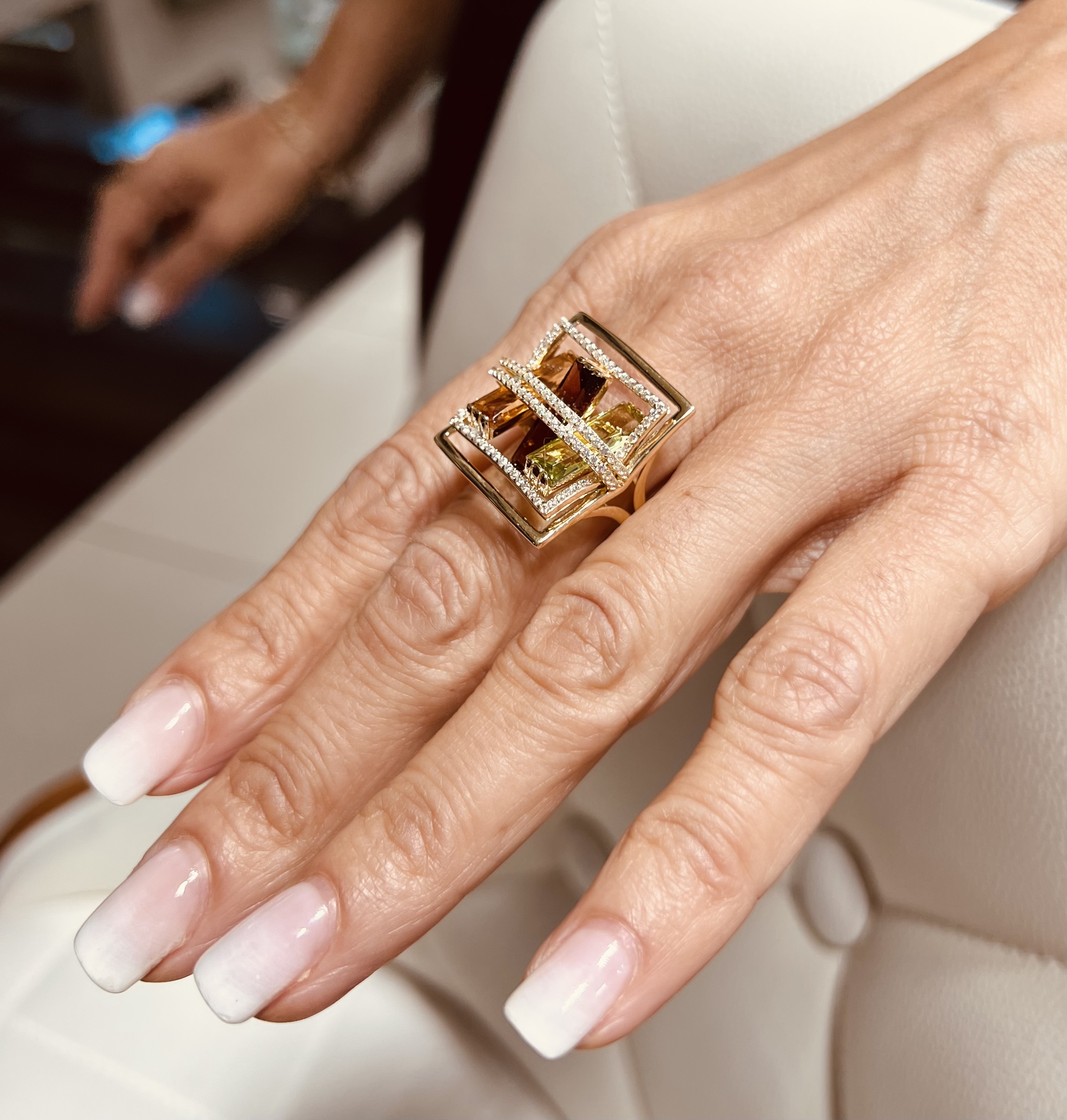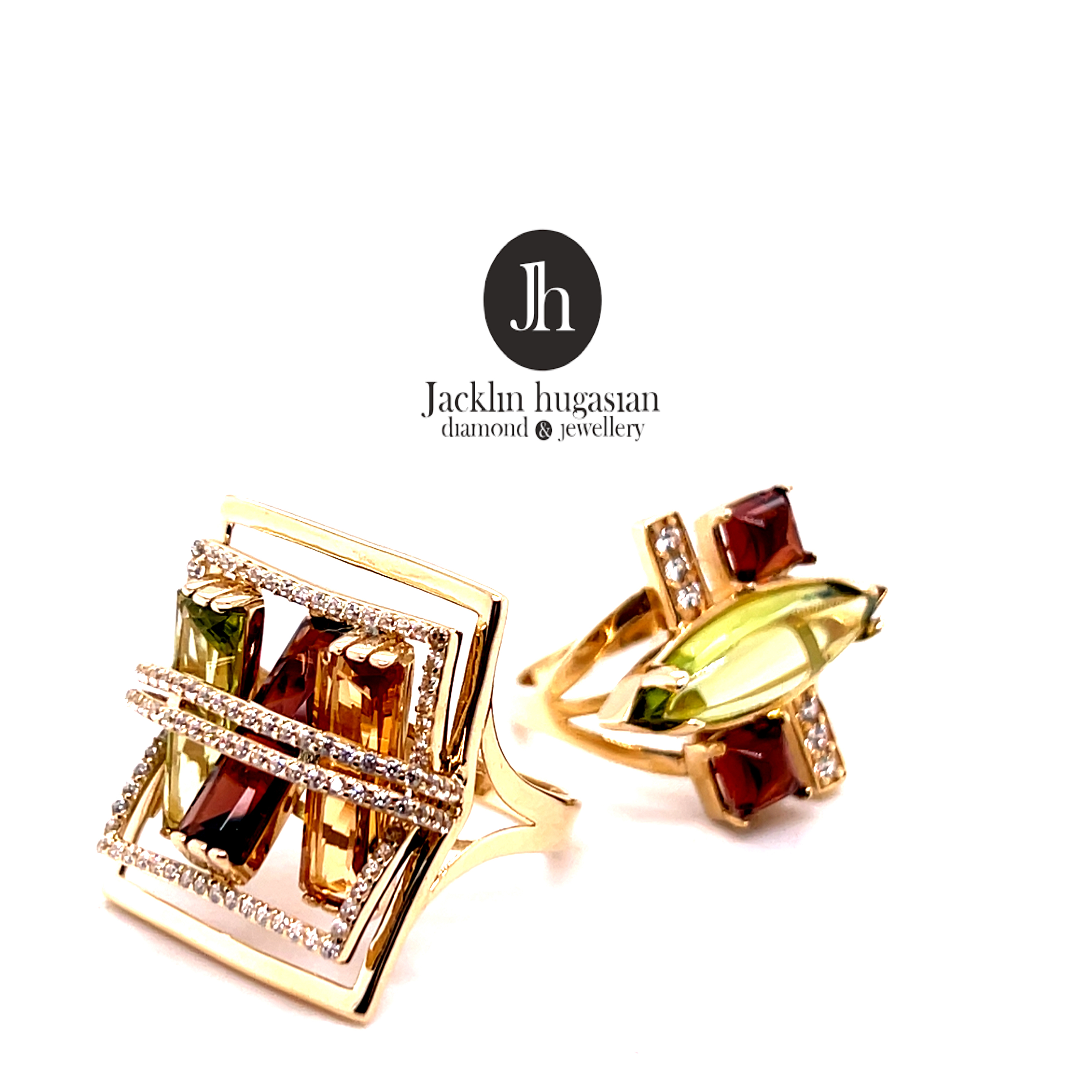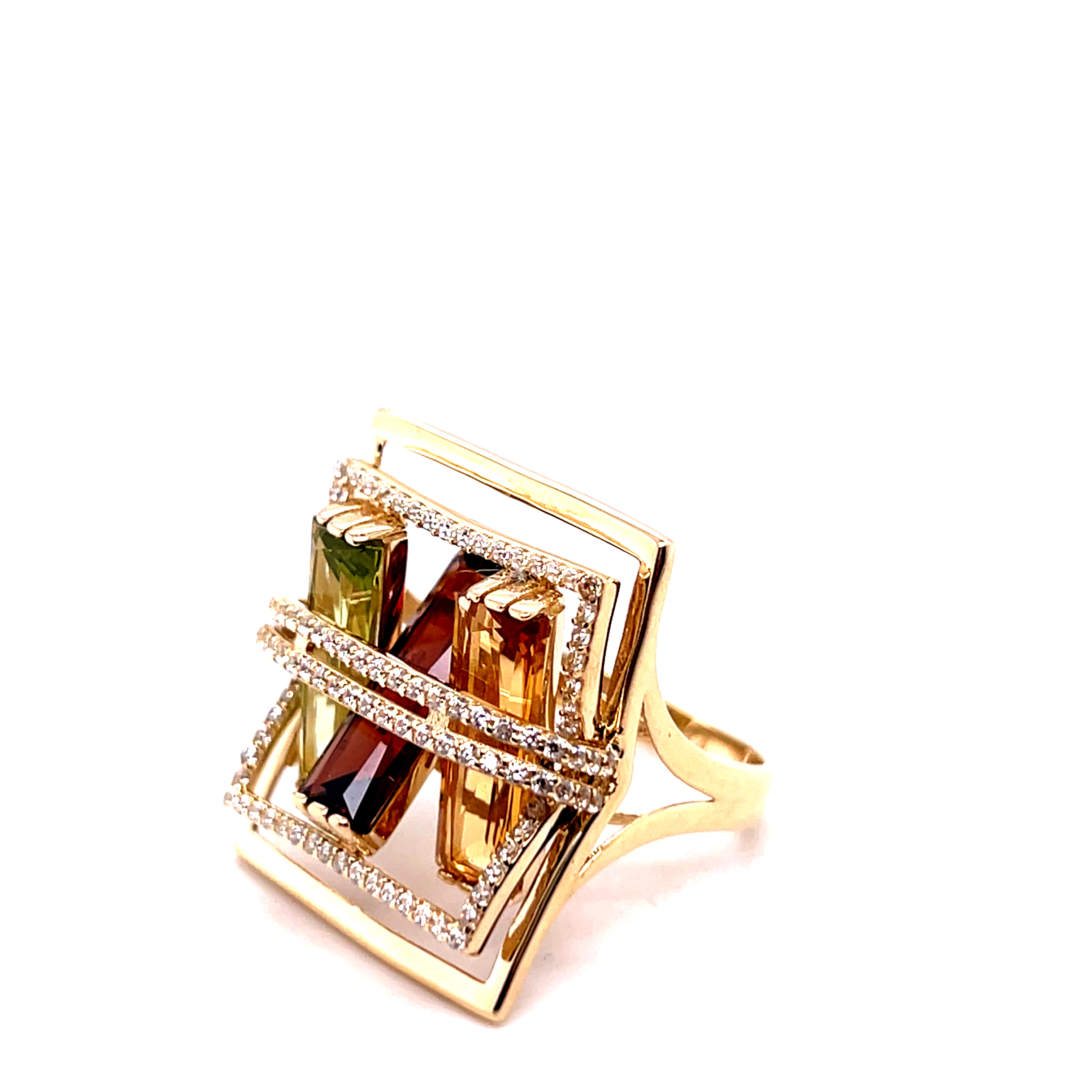 Пръстен от "Jacklin hugasian" в жълто злато с перидот, златист топаз и циркони.