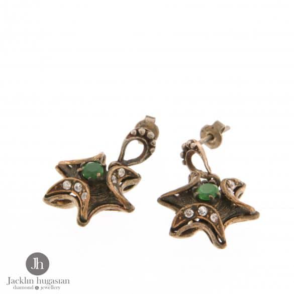 Обеци от "Jacklin hugasian" оксидирано сребро с позлата и изумруд и цирконии. Дължина обеци 2.5 см., широчина 1.9 см. Колекция " SULTAN ".