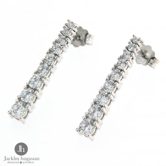 Обеци от " Jacklin hugasian " в бяло злато,гланц с цирконии. Дължина обеци 2.5 см., широчина 0.3 см.Произход Италия.