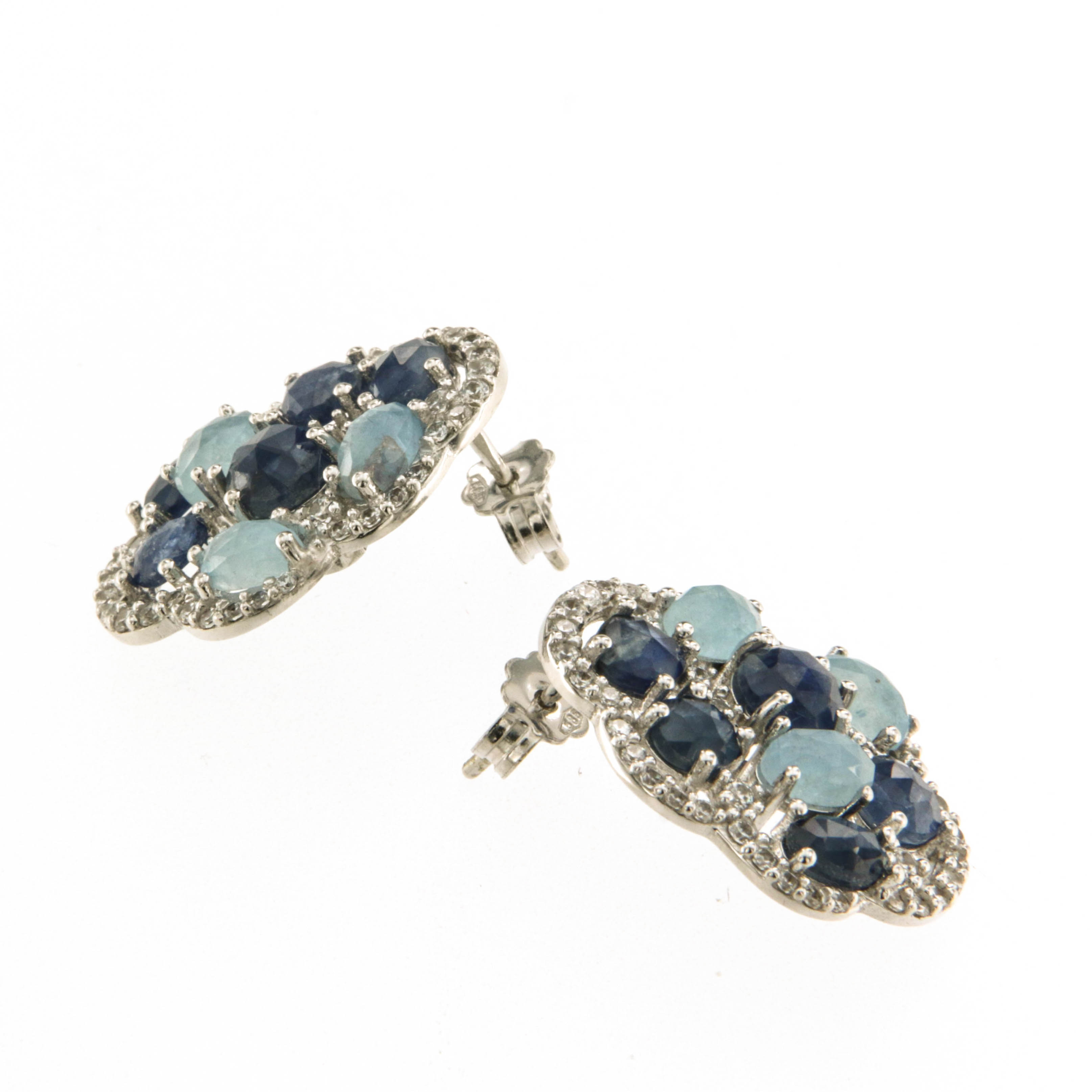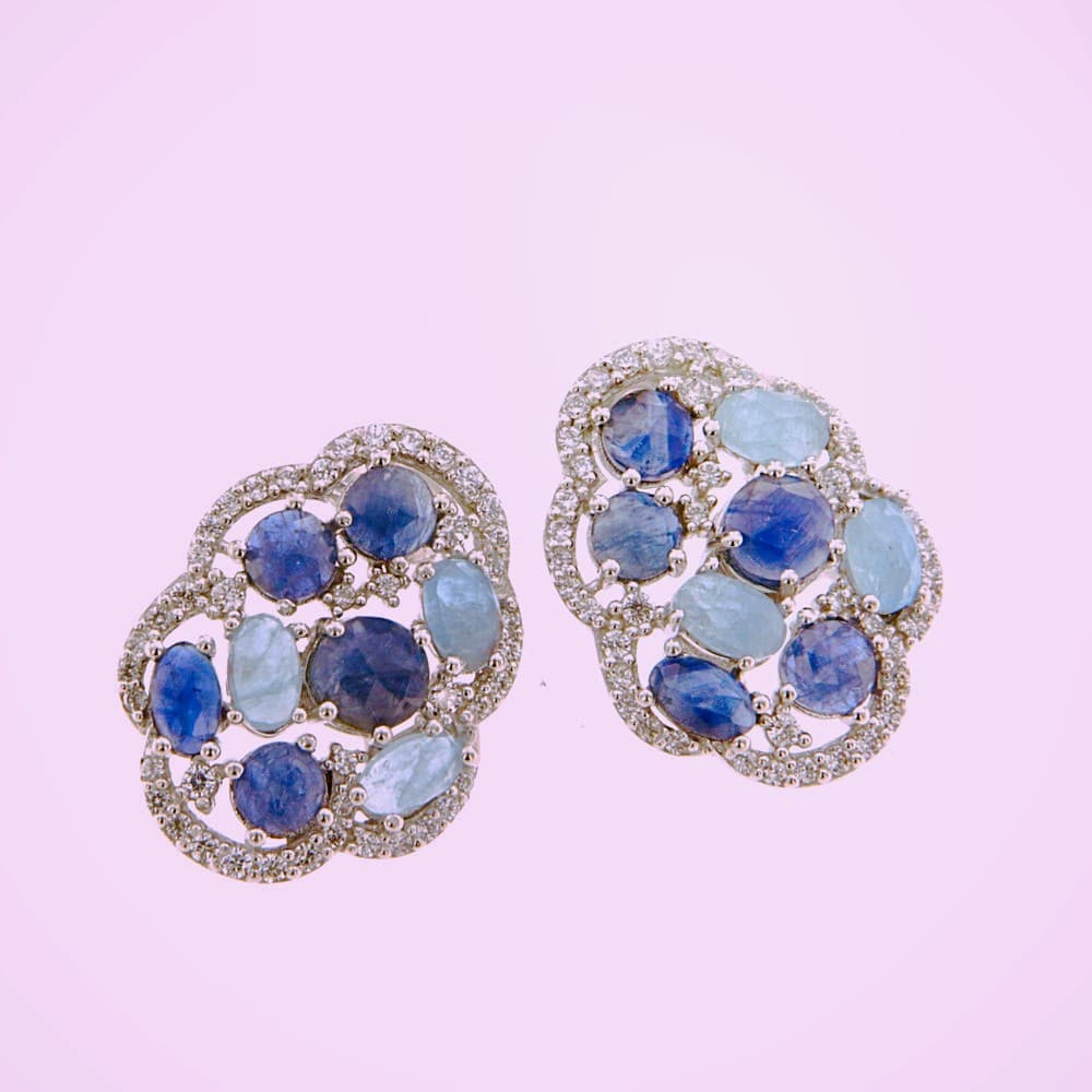 Обеци от " Jacklin hugasian " в бяло злато с цирконии,сапфир и син топаз.Дължина обеци 2.2 см., широчина 1.5 см.Произход Италия.
