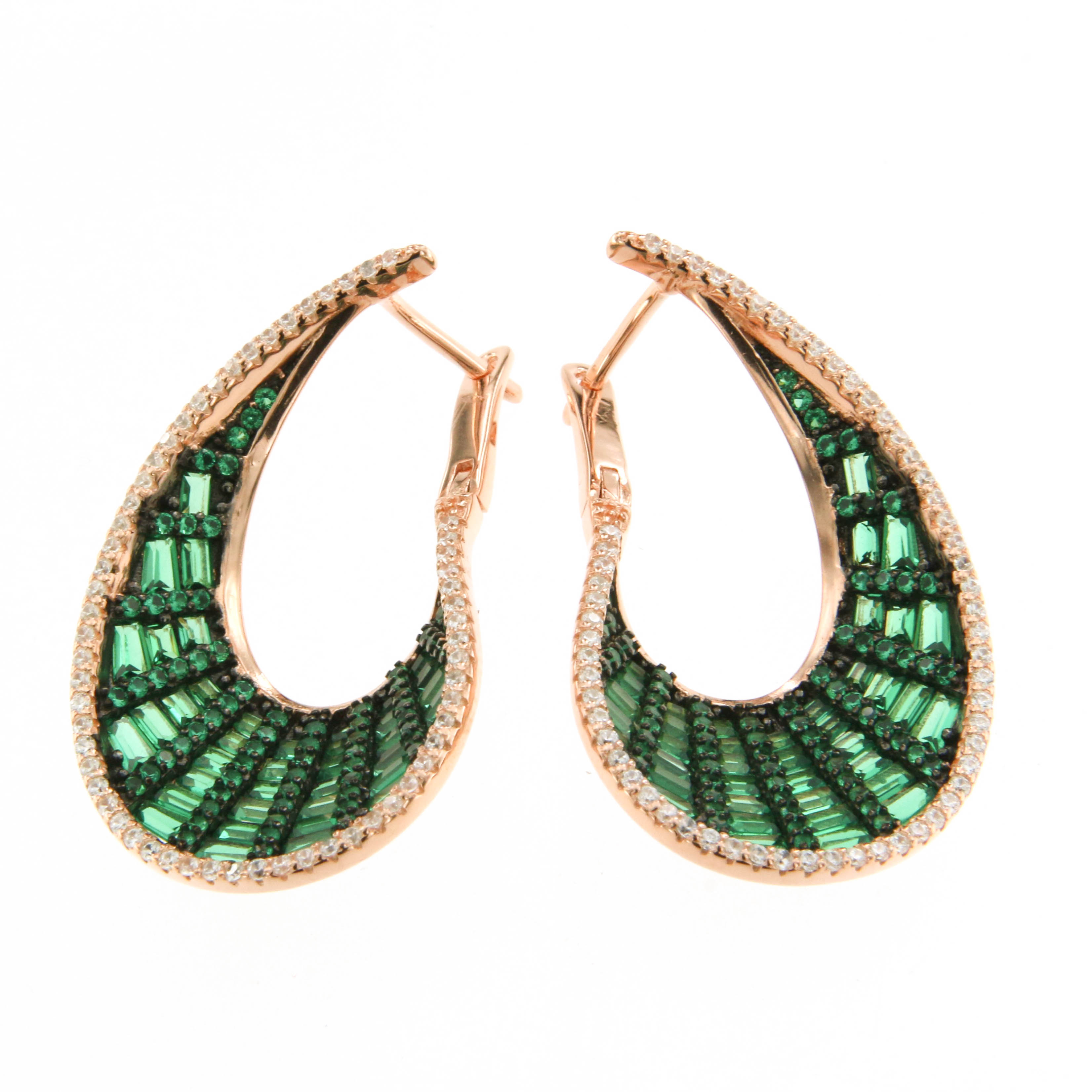 Обеци от "Jacklin hugasian" в розово сребро с цирконии и зелен изумруд. Дължина обеци 3.4 см. , широчина 2.00 см.