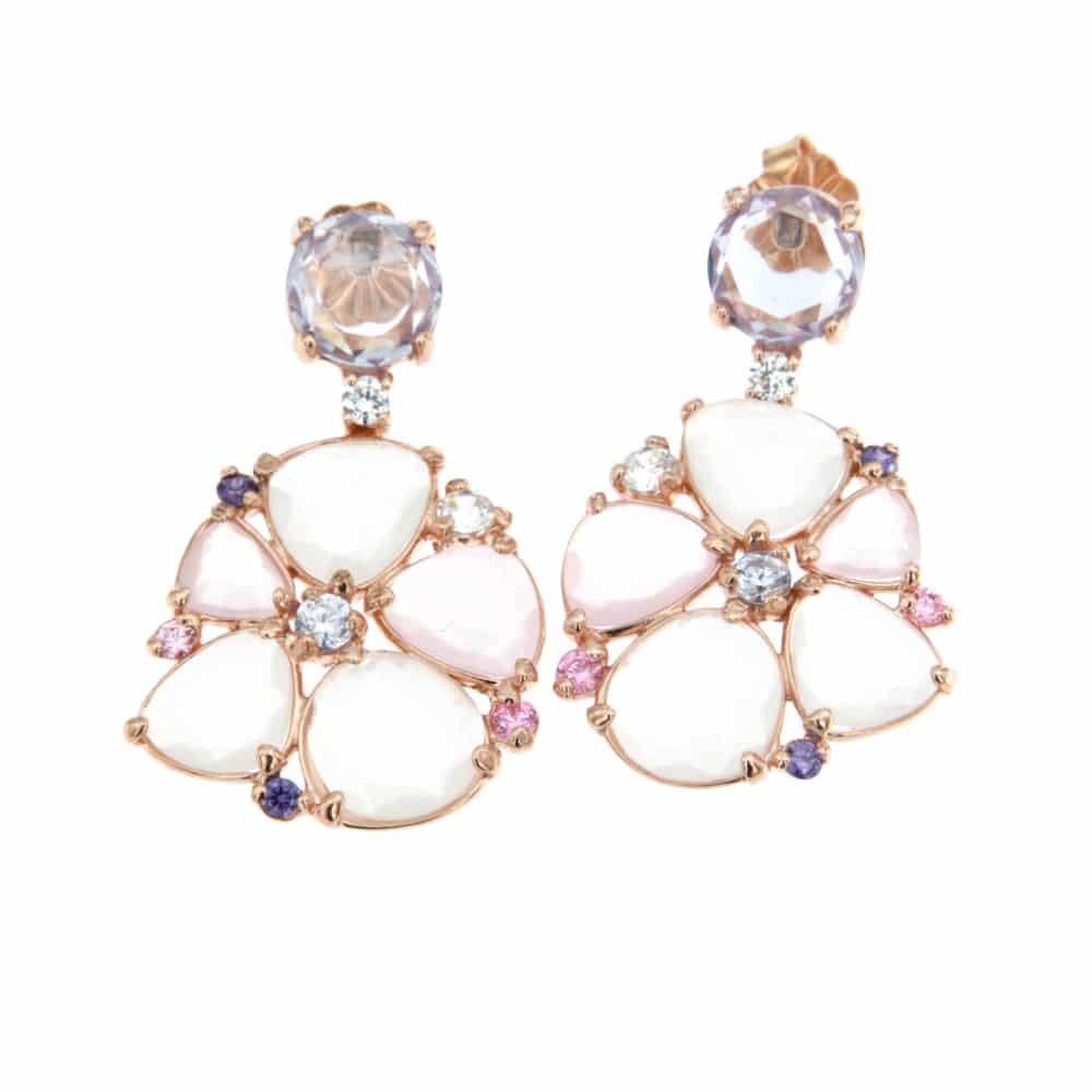 Обеци от "Jacklin hugasian" в розово сребро с разноцветни камъни : аметист, розов и бял кварц, циркон. Дължина обеци 3.3 см., широчина обеци 2.00 см.