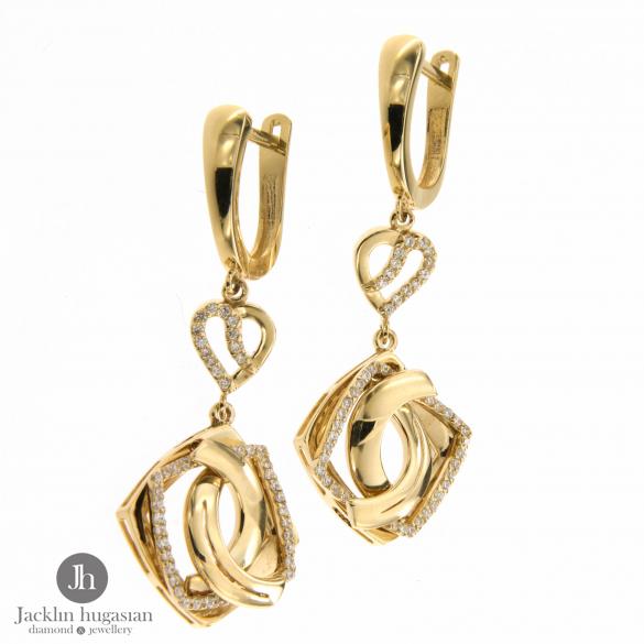 Висящи обеци от " Jacklin hugasian " в жълто злато,гланц с цирконии.Дължина обеци 4.4 см.,широчина обеци 1.7 см.