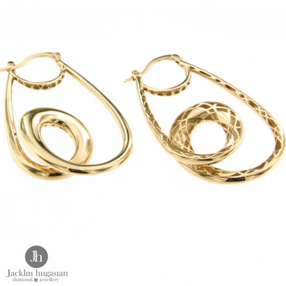 Висящи обеци от " Jacklin hugasian " в жълто злато,гланц, олекотени.Дължина обеци 4.6 см., широчина 2.7 см.